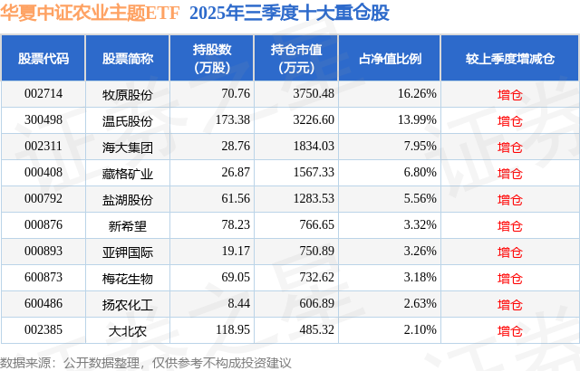 从基金规模来看,中原中证农业主题ETF基金2025年三季度公布的基金规模为2.31亿元,较上一期规模1.75亿元变化了5611.99万元,环比变化了32.15%。该基金最新一期金钱建立为:股票占净值比98.37%,无债券类金钱,现款占净值比1.67%。从基金捏仓来看,该基金当季前十大股票仓位达65.05%,第一大重仓股为牧原股份(002714),捏仓占比为16.26%。